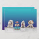 Cupcakes e cachorrinhos te convidam para uma celebração especial. Três adoráveis filhotes travessos resgatados olhando para uma carrossel de cupcakes na frente, fundo gradiente azul no verso. Personalize com as informações da sua festa.
