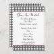 Um convite simples com um desenho xadrez cinza carvão na parte superior e inferior da frente. Corte rosa e fonte em negrito de fita preta. Personalize com detalhes da sua ocasião. O lado oposto apresenta um design sólido com uma forma circular no meio, enquadrando o texto.