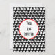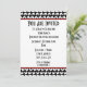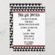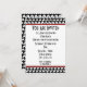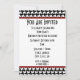 Um convite simples com um desenho de xadrez no topo e na parte inferior da frente. acabamento vermelho e fonte retrô. Personalize com detalhes da sua ocasião. O lado oposto apresenta um design sólido com uma forma circular no meio, enquadrando o texto.