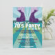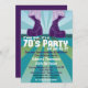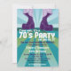 Um convite divertido dos anos 70 para comemorações ou qualquer ocasião, com fundos roxos e calçados de plataforma em fundo azul e verde.
