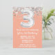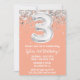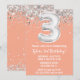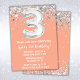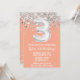 Pêssego e convite de aniversário 3.º convite de aniversário de idade 3 com brilho e escrevendo moderno de escrita e balões de folha divertida.