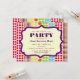 Um convite de festas genérico com todos os objetivos apresentando um plano de fundo de linhas de bolinhas em vários tamanhos e cores inspiradas pela boêmia na frente e no verso. Personalize o quadro de dentro de texto roxo e burro na frente com detalhes da sua ocasião.