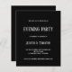 Texto Branco do Orçamento Convite de festas da Noite Negra. 100% personalizável. Um design tipográfico moderno em um cartão de ponto-e-vírgula de preço de 4,5 x 5,6 pol (semelhante à espessura de um cartão postal) menor para convidar seus convidados noturnos para o seu casamento. As cores podem ser alteradas se necessário por meio de personalização adicional.