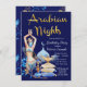 Noites árabes convites de festas de aniversários com belas ilustrações azuis e douradas sobre um fundo azul real. Esta maravilhosa festa de aniversário da noite árabe e este convite para eventos é facilmente personalizado para o seu evento simplesmente adicionando os seus detalhes. Você também pode alterar a cor de fundo. Este é um design impresso sem brilho real, folha de alumínio, etc.