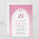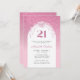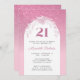 Em um fundo de rosa claro, nosso elegante convite de festas apresenta um design brilhante, rosa, feminino, com um spray floral de rosa claro sobre a parte superior do quadro de texto branco. O número "21" é representado como um grande gráfico cor-de-rosa acima do convite para o aniversário da honraria. Todo texto de exemplo pode ser facilmente revisado no modelo de personalização. A parte traseira deste convite para aniversário de 21 anos também exibe o design de brilho ombre exclusivo.