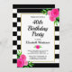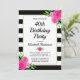 Este belo e clássico design apresenta flores cor-de-água rosa pintadas manualmente contra um fundo de alto contraste de listras brancas e pretas. No centro está uma área branca de cor dourada contendo o texto personalizável para seu dia especial em tipografia popular e elegante.
