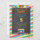 Um Convite de aniversário colorido para crianças com bandeiras, um fundo listrado colorido e uma ilustração da casa de ressalto.