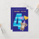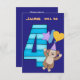 Este é um design convite de aniversário colorido, com uma imagem azul e lacrimejada número quatro, e um macaco marrom giro com um chapéu de aniversário e segurando balões na frente dele. A parte superior do convite diz (Nome) será (4). A imagem e o texto são colocados sobre um fundo roxo brilhante. A parte traseira do cartão é a mesma roxa, com as informações da sua festa em branco. Maravilhoso para a quarta festa de aniversário do seu filho! *Obrigados para a Clipart Real Deal para o cliente usado para criar este design.