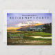 Convite de festas de aposentadoria apresentando um campo de golfe em uma bela paisagem colorida. No verso, você pode encontrar um design striped elegante (você pode substituí-lo pela sua própria imagem, se quiser, ou escolher uma cor simples).