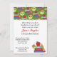 Um convite bonito perfeito para qualquer professor se aposentar. Ele apresenta uma parte superior verde com livros e lápis de cartoon. Um gráfico de uma fita branca corre pelo topo. Você personaliza todo o texto.