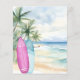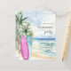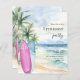 Um convite para uma festa de aposentadoria, para homens e mulheres. Uma praia arenosa de cor aquática, ondas oceânicas e palmeiras como fundo, e uma prancha de surfe azul e rosa na praia. 1 folha = 1 convite impresso de borda a borda.
