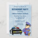 Convite de aposentadoria para um policial aposentado. Design tem um carro de polícia e um policial.