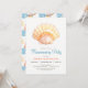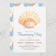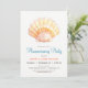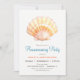 Convite para comemoração da festa de limpeza da casa de Seashell, no verão náutico. Convide recursos azuis, cor de pêssego e conchas laranja.