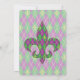 Este convite apresenta um padrão harlequin de verde e roxo se transforma em um argilo lúdico com uma camada de contornos de diamante de ouro e flur de lis, criando um padrão divertido e colorido perfeito para qualquer celebração de New Orleans influenciou Mardi Gras. A parte inferior da placa tem algum texto de exemplo que você pode personalizar para criar um convite personalizado para sua festa ou evento, e a parte traseira apresenta um fluer de lis padronizado em um fundo argyle esmaecido para aquele último toque especial.