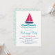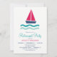 Convite de festas de aposentadoria em veleiro náutico. O Convite apresenta marinho azul, rosa, turquesa, veleiro e ondas.