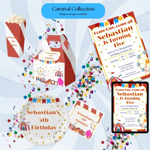 Venha! Convide seus convidados para o maior show da terra com este convite moderno e caprichoso com tema de carnaval. O design apresenta um toldo colorido e uma roda-gigante alegre, cercada por todos os seus lanches favoritos de feira, como pipoca, cachorro-quente e uma bebida de carnaval. Este convite personalizável é perfeito para a festa de aniversário de uma criança e prepara o cenário para um dia cheio de jogos, guloseimas e diversão!