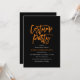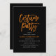 Este convite à fantasia moderno de halloween inclui as palavras "festas à fantasia" num roteiro manuscrito a laranja. Os detalhes da parte são exibidos abaixo.