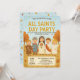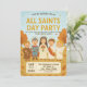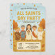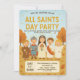 Celebre a alegria do Dia de Todos os Santos com este charmoso e amigável convite com crianças ilustradas adoráveis vestidas de santos contra um belo pano de fundo de outono. Perfeito para grupos religiosos, escolas, cooperativas e famílias, esta design dá um tom divertido e reverente para sua celebração. Na frente lê-se: "Você é convidado para uma Festa do Dia de Todos os Santos" e inclui um texto de exemplo: "Junte-se a nós para comida, jogos e um concurso de fantasia! Traga um prato para compartilhar!" juntamente com detalhes de data, hora, local e RSVP. O verso apresenta um design de coordenação de folhas coloridas de queda contra um céu azul. Totalmente personalizável — mude o texto para se adequar ao seu evento e faça dele seu próprio!