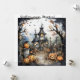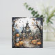 Jack-o-lanternas olha como três esqueletos dançando em frente a uma casa assombrada neste belo e divertido convite do Festa de Halloween. A parte de trás é simples, com muito espaço para o seu texto.