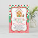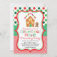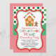 Nosso Convite de festas festivo e divertido Gingerbird House Decorating apresenta bolinhas e listras vermelhas e verdes e uma adorável casa decorada de Gingermore e gingerpão. Perfeito para qualquer casa de pão de gengibre decorando a festa de Natal!