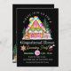 Um convite à decoração da casa de gengibre preto com uma casa colorida de pão de gengibre, boneco de neve e pão de gengibre design. Este convite de festas de cookie de feriado está disponível para ser personalizado com suas informações.
