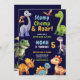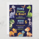 Um convite de aniversário para dinossauros é um convite para festas temáticas com gráficos divertidos para dinossauros, cores ousadas e texto lúdico como "Stomp, Chomp e Roar!" Designs populares apresentam dinossauros de desenho animado, fundos inspirados em fósseis, ou cenário da selva. Perfeito para crianças que amam dinossauros, eles deram o tom para uma celebração pré-histórica de temas de aventura!