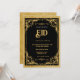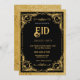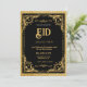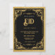 Um convite de janto Eid com um quadro de ornamentado preto e dourado A placa é fácil de personalizar com seu texto, fonte, cor da fonte, opções de forma de papel e opções de tipos de papel. A paleta colorida do design parece estonteante na frente, enquanto o rosa-escuro contrastando no verso torna este convite de festas eid verdadeiramente único.