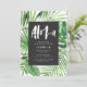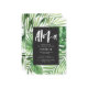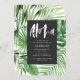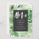 Convites de festas de folhagem modernas de palmeiras tropicais. Texto do script de efeito pintado à mão. Parte de uma coleção de tendência de verão. Design monocromático preto e branco moderno.