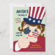 Convide seus convidados para a Festa de aniversário de 4 de julho da sua garota com esta bela ilustração original! É cheio brilhante e colorido! Este Convite de aniversário do Dia da Independência é facilmente personalizado para o seu evento adicionando os seus detalhes. Na frente, ela mostra uma garota convidando amigos para sua festa de aniversário vestindo um chapéu de cima com estrelas e listras. Você encontrará filas de estrelas vermelhas, azuis e brancas no verso deste convite. É ideal para um nascer feminino nesta data histórica e um quarto partido temático de julho. Esta ilustração foi inspirada por um símbolo patriótico dos Estados Unidos, Tio Sam.