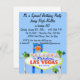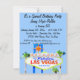 Convites de festas de Las Vegas do divertimento com um fundo azul bonito, mostrado aqui para 50th festas de aniversário. Um design colorido e do divertimento.