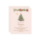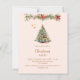 Um convite de inverno para uma festa de Natal. Um fundo creme macio, bege, na frente, decorado com um pinheiro desenhado à mão, de cor aquosa, com ornamentos vermelhos e ouros. Algumas estrelas e uma terra decorada no Natal com cones e flores vermelhas de Poinsettia. Personalize e adicione os detalhes da sua festa. Texto do ouro. 1 folha = 1 convite impresso de borda a borda.
