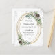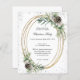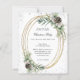 Um fundo branco. Uma estrutura de ouro falsa, decorada com cones, berros brancos e verde-pinheiro. Brilhante de prata, brilho. Personalize e adicione os detalhes. Texto preto. Código QR para o seu site para RSVP e detalhes do partido. 1 folha = 1 convite impresso de borda a borda.