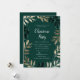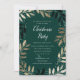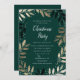 Um convite elegante para festas de Natal, que inclui galhos de pinheiros de folha falsa desenhados à mão numa paleta festiva de cor verde e dourada concebida por Stacey Meacham.