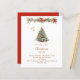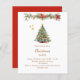 Um convite de inverno para uma festa de Natal. Um fundo branco na frente, decorado com um pinheiro desenhado à mão, de cor aquosa, com ornamentos vermelhos e ouros. Algumas estrelas e uma terra decorada no Natal com cones e flores vermelhas de Poinsettia. Personalize e adicione os detalhes da sua festa. Texto do ouro. Fundo: fundo vermelho. Adicione a url do site ao código QR para RSVP e/ou detalhes da parte. 1 folha = 1 convite impresso de borda a borda.