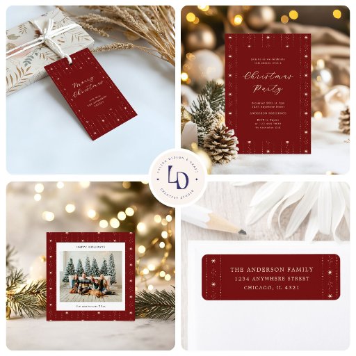 Convite de festas de Natal com um fundo de wallpaper listrado vermelho e creme com um script elegante e fonte serif na qual sua informação personalizada é escrita. Veja na nossa loja mais itens desta coleção.