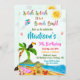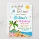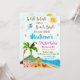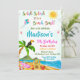 Convite de festas de Piscina de convite para aniversário de praia para garoto ou piscina tropical convite Splish Splash! É um bash de praia! Um belo convite de verão para o aniversário de um menino ou de uma menina, apresentando o Sol Yelow, a praia, o gafanhoto, o tucano na palmeira e um oceano azul. Basta editar este modelo fácil de usar no menu Personalização.