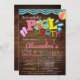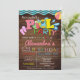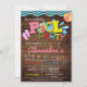 Uma Convite de festas de Piscina para Meninas. convite de festas de piscina sobre fundo de madeira com elementos coloridos de piscina de verão, ondas de água azul e bola de praia. Perfeito para uma Festa de aniversário lá fora com amigos mais próximos.