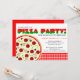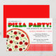 Nosso Convite de festas de pizza fará todos terem fome de pizza! O design apresenta as palavras "Pizza Party!" em vermelho e verde, ao lado de uma toalha vermelha e branca e uma pizza suprema grande.