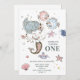 Uma aquarela e um convite de festas de primeiro aniversario com tema de sereia ilustrado. Sereia e sobreposição de peixes sobre um fundo de aquarela com criaturas do mar ao seu redor. Um belo convite para estilo artístico e caprichoso.