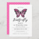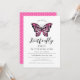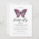 Primeiro convite de aniversário de borboleta rosa que pode ser personalizado com a inclusão dos detalhes de seu aniversário. O design é moderno, bonito, feminino e em dois tons de rosa. A fonte está em um bonito estilo caligráfico.