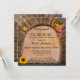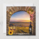 Um convite de festas de aposentadoria original com uma pintura de um arco romano com uvas, uma lanterna, vidros de vinho e garrafa com girassol, com vista a uma paisagem vinícola no pôr do sol. Você também pode personalizar este convite para outras ocasiões, se quiser.
