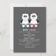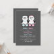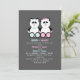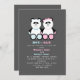 Um convite de festas de gênero revela ilustrações de dois ursos panda. Ursinha veste um arco rosa, colar rosa e tem orelhas e pés cor-de-rosa. Urso-rapaz veste uma gravata arco azul e tem orelhas e pés de gingham azuis.