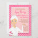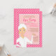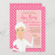 Uma bonito garota de olhos azuis está pegando uma manicure enquanto escondido em seu roupão branco peludo por um dia de pampering no spa. Uma ideia de festa de aniversário excelente para adolescentes ou adolescentes e uma forma excelente de celebrar formandos e noivas! Em tons bonito de rosa com bolinhas brancas.