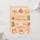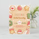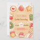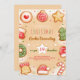 Um convite de festas decorador de biscoitos de Natal. Num fundo de bolachas, os biscoitos decorados com gelo como borbulhas, meias, árvores de Natal, estrelas, sinos e chapéus de santa estão rodeados por farinha e borrifadas verdes e tortas vermelhas. A data do evento é exibida dentro de uma estrela recortada da mistura de cookies.
