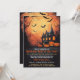 O convite da festa de Halloween apresenta uma cena assustadora com uma casa assombrada posicionada no lado direito do cartão. A casa assombrada é escura e dilapidada, com janelas brilhantes e umas poucas lanternas-de-jack com ressonância maliciosa colocadas ao redor de seus degraus dianteiros. No lado esquerdo da carta, alguns morcegos estão circulando no céu iluminado pela lua, aumentando a ambição assustadora. O texto é colocado na parte inferior da frente da placa. Todo o texto é totalmente personalizável, permitindo que você ajuste a data, a hora e o local da parte, bem como a fonte e as cores para corresponder ao seu estilo. O verso do convite espelha o design da frente, com a casa assombrada, Jack-o-lanternas, e morcegos sutilmente desbotados ao fundo para permitir que o texto se destacasse. A seção RSVP está localizada na parte inferior, onde você pode incluir detalhes de RSVP personalizáveis, como informações de contato e o prazo de RSVP. Acima da seção RSVP, há linhas extras para instruções personalizadas ou detalhes adicionais do partido, como "Não esqueça seus calçados dançantes!" ou "Cuidado com surpresas assustadoras!" Este convite combina perfeitamente uma atmosfera assustadora e divertida, dando o tom para uma celebração inesquecível do Dia das Bruxas.