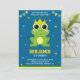 Convide seus convidados com este convite de festas de aniversário bonito apresentando um adorável sapo com elementos vibrantes sobre um fundo azul. Basta adicionar os detalhes do seu evento neste modelo fácil de usar para torná-lo um convite único. Sacudir a placa para ver um padrão de listras verde e branca na parte traseira da placa.