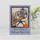 Convide seus convidados para uma festa de Halloween com um guaxinim adorável segurando um mouse sentado em uma mesa com um laptop e um doce de Halloween em uma cadeira de escritório. O fundo é um padrão azul bonito com uma nota pegajosa dizendo hora da festa e uma bruxa voando sobre um cemitério