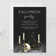 Este convite de Halloween na moda é perfeito para a sua festa de Halloween. Design apresenta um crânio gótico branco, velas brilhantes queimadas e chapéu de bruxa pontiagudo sobre fundo escuro. Personalize com os detalhes do seu partido.