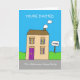 Uma casa bonito dos desenhos animados com o fumo que sai d é chaminé. As palavras "que você é convidado a um partido Home bem-vindo" acompanham a imagem.