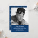 Anúncio de formatura de fotos e convite de festas com tema esportivo. Azul marinho escuro com texto branco embaixo de uma grande foto do formando. O reverso tem um padrão de bolas de futebol e baseball. Adicione a foto ao modelo e mova-a para a posição desejada.